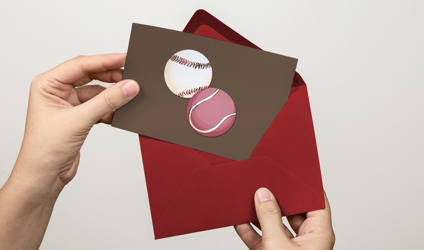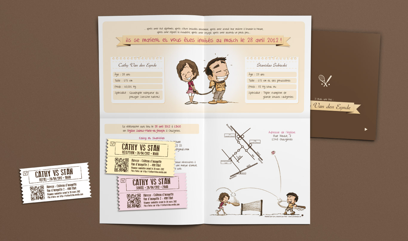 J’ai créé pour ces jeunes mariés un faire-part original que les gens auraient envie de garder comme un bel objet. C’est un livre dessiné qui raconte leur histoire à chacun jusqu’à leur rencontre amoureuse avec une double page centrale qui s’ouvre comme un poster pour les détails de la célébration. L’ensemble a été travaillé avec eux dans les teintes de la décoration des tables et inspiré de leurs univers sportifs. Ce livret a eu beaucoup de succès auprès des invités.